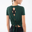 Dark green Agate women's sports top with mesh panels, short sleeves, breathable fabric, and quick-dry material for fitness activities.