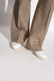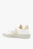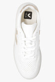 Baskets « V-10 » blanches et dorées de Veja. Ce modèle à lacets en cuir arbore un logo embossé sur la languette, des perforations, des lacets en coton biologique et le patch V doré emblématique de la marque, réalisé en caoutchouc et en résidus de riz. La doublure intérieure en mesh recyclé offre une meilleure résistance à l'abrasion. La semelle intérieure, composée de matières biologiques et recyclées, est constituée de canne à sucre, de caoutchouc d'Amazonie, de coton biologique et d'EVA recyclé. Elle repose sur une semelle extérieure en caoutchouc crème, également issue de matériaux biologiques et recyclés. Le cuir provient d'élevages du Rio Grande do Sul et est certifié LWG Gold par le Leather Working Group, qui promeut des pratiques durables et respectueuses de l'environnement dans les tanneries. Hauteur de la semelle : 2,5 cm. Hauteur de la semelle au point le plus haut : 3,5 cm.